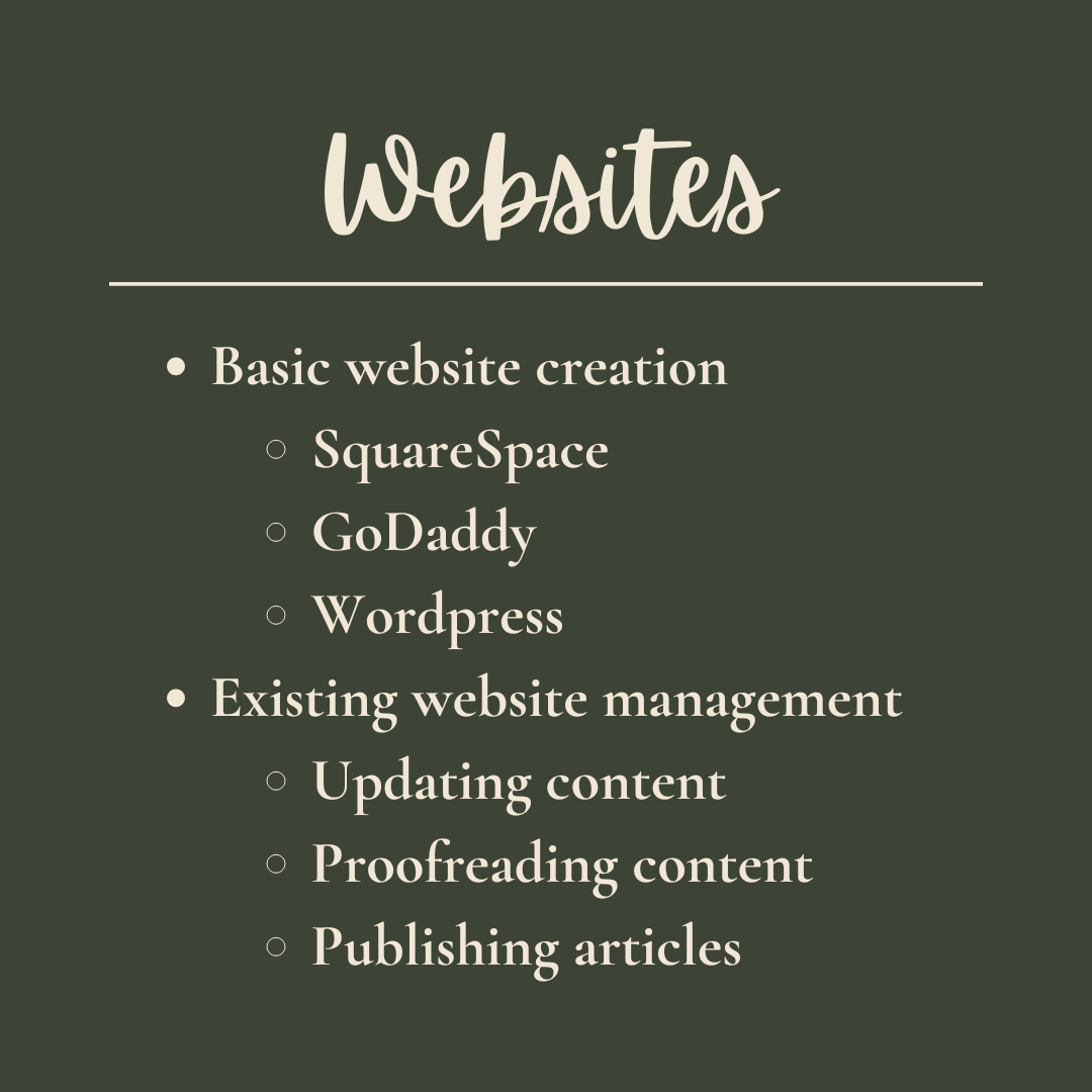 I have comprehensive knowledge of the Microsoft 365 Suite including admin centre management, creation of new users and accounts, and the creation and management of SharePoint sites. I have basic website building skills using platforms such as SquareSpace, GoDaddy and Wix; and can also assist with website management and updates to existing sites.